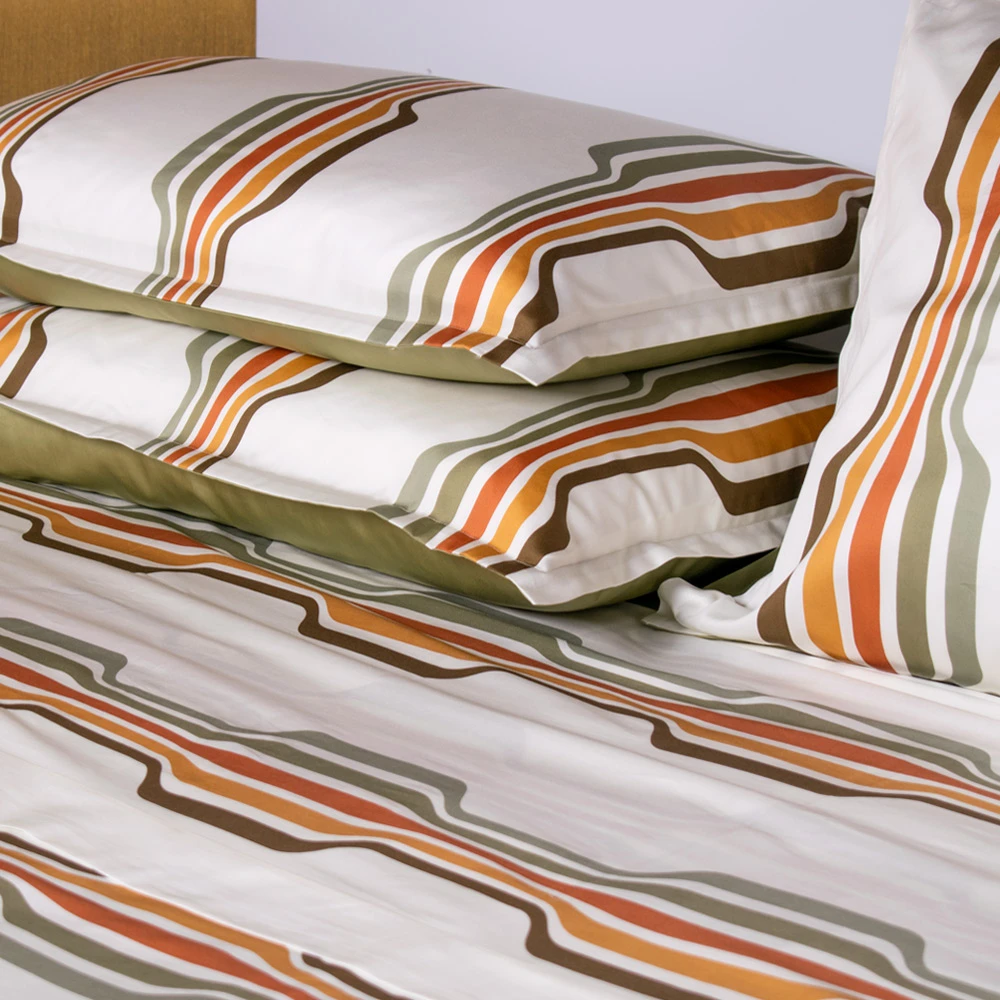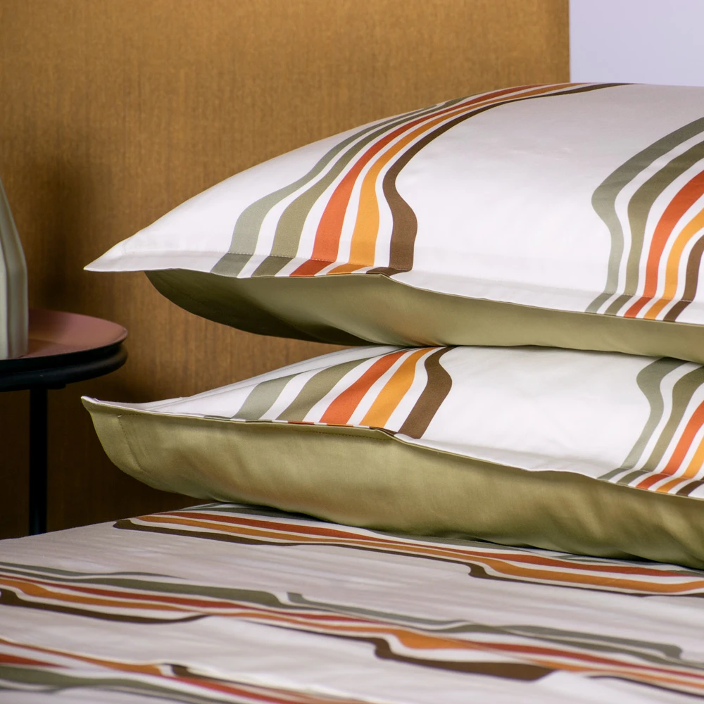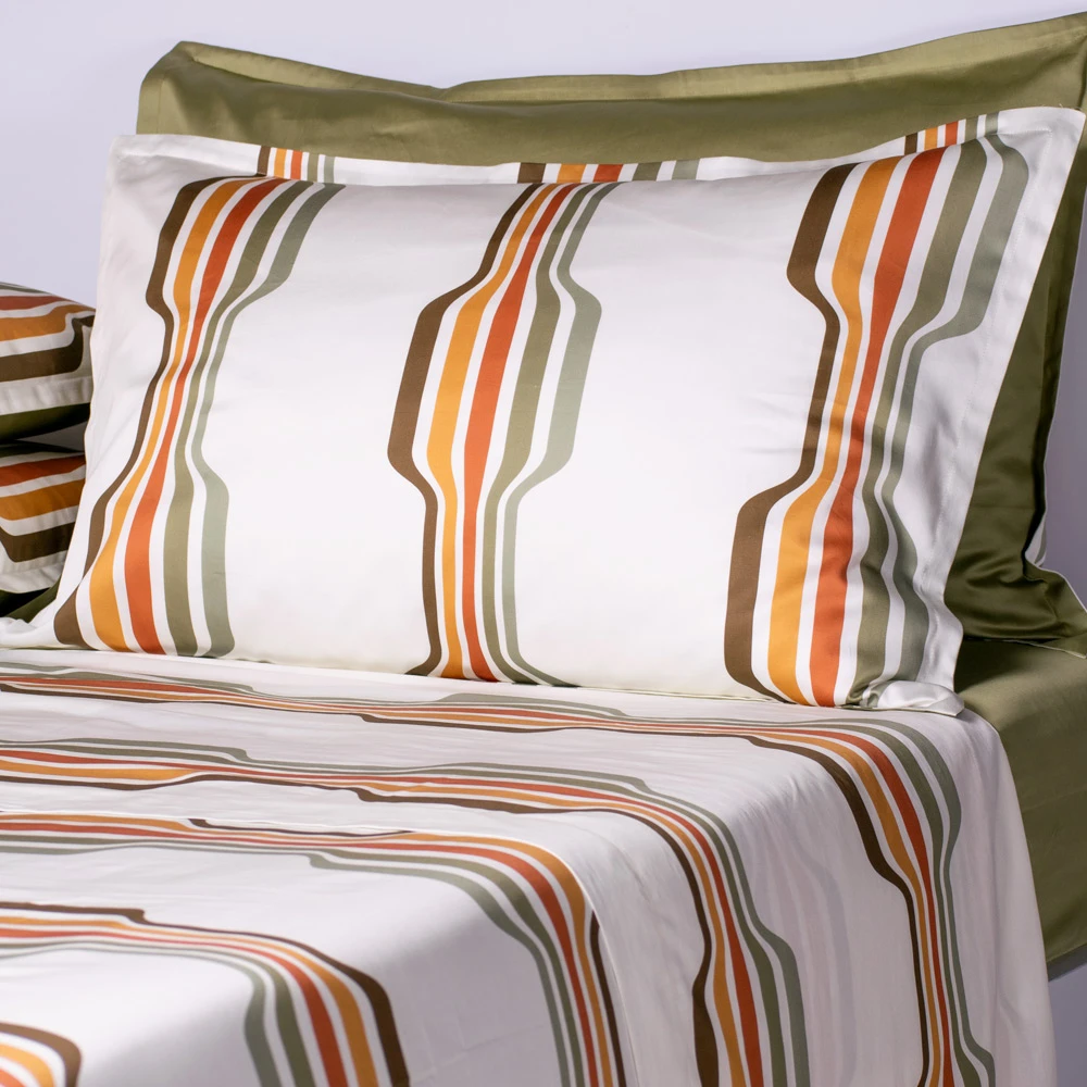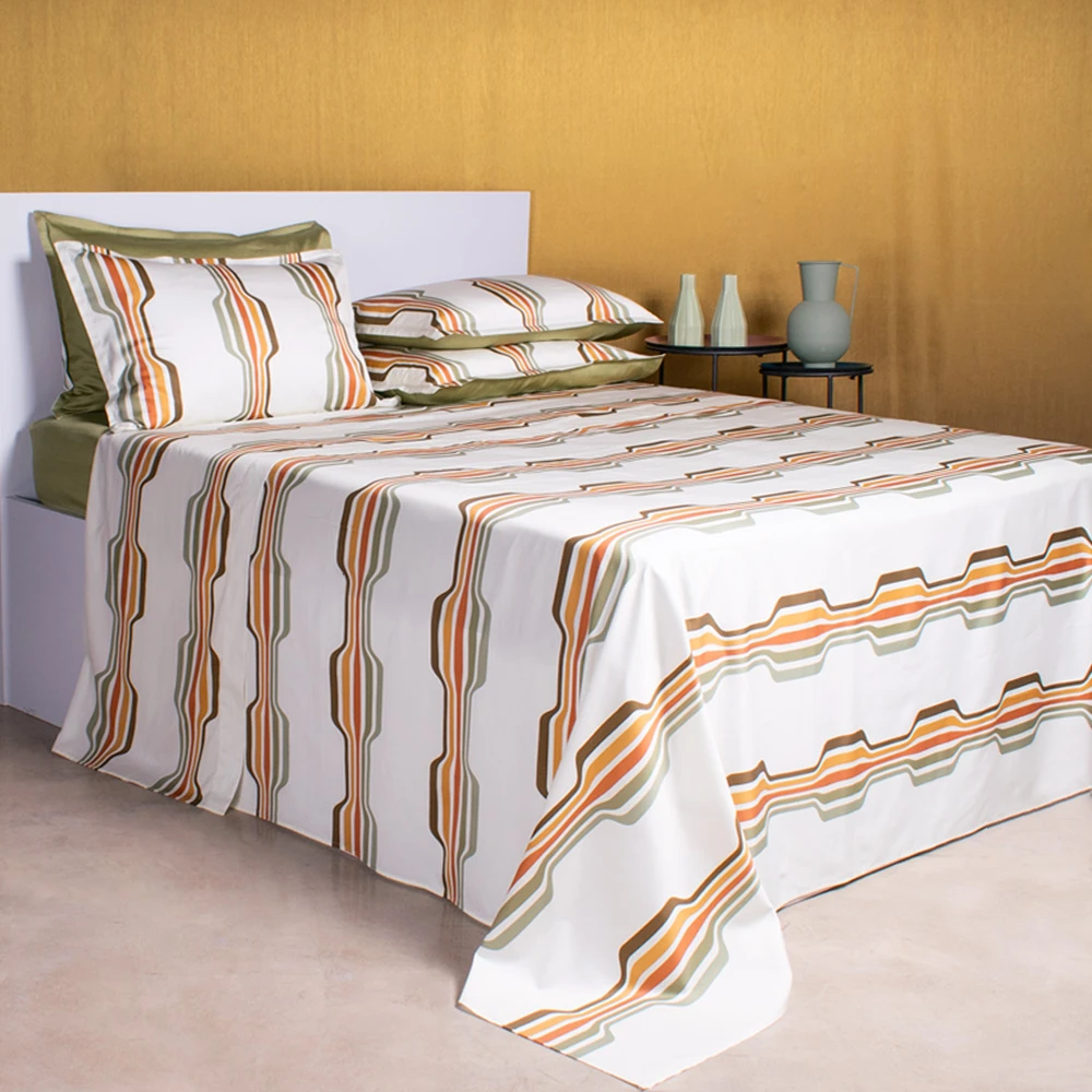 Verwandeln Sie Ihr Schlafzimmer in ein lebendiges Refugium mit unserer Bettwäsche Morelia, inspiriert von den warmen Farben und Geometrien der 70er Jahre. Diese außergewöhnliche Kollektion bietet eine einzigartige Kombination aus reichen Erdtönen, sanften Grüntönen und kräftigen Linien und schafft eine Ästhetik, die sowohl nostalgisch als auch modern ist.