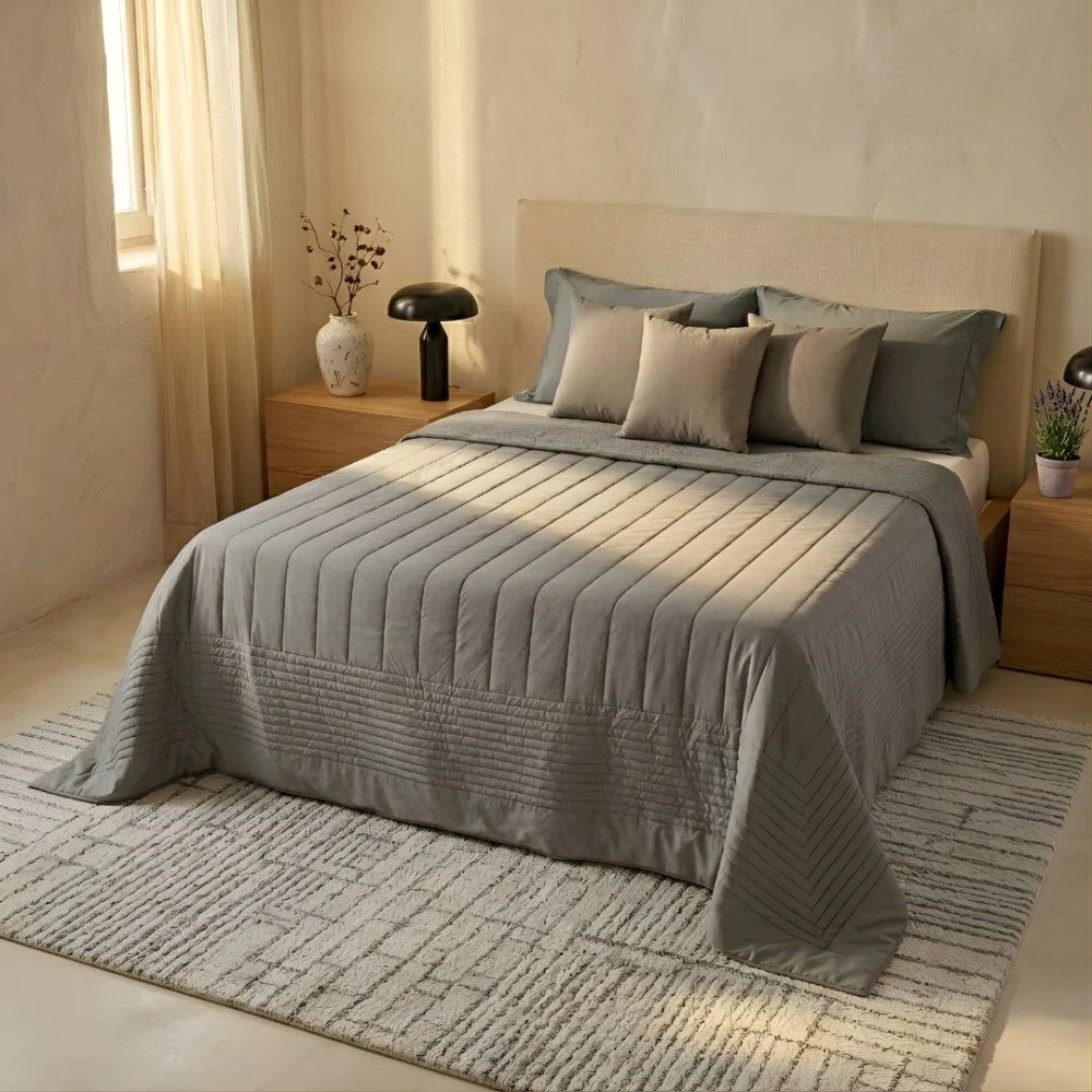 Genießen Sie die zeitlose Frische und Weichheit dieser Steppdecke mit matten, atmungsaktiven und natürliche Thermoregulator Stoffes.